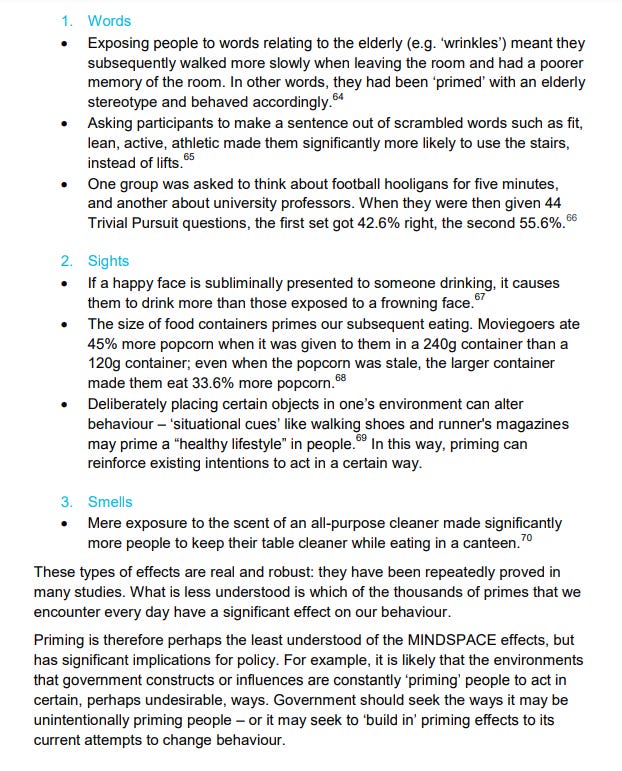 For instance, the MINDSPACE report details various ways in which subtle behavioral “nudges” could be used to significantly alter the outcome of individual decision-making, without ever eliciting the intervention of conscious “reflective systems.” Instead, individuals are simply guided by a series of clever unconscious “nudges” and subliminal “cues” which leverage “mental shortcuts” and other “automatic motivations.”