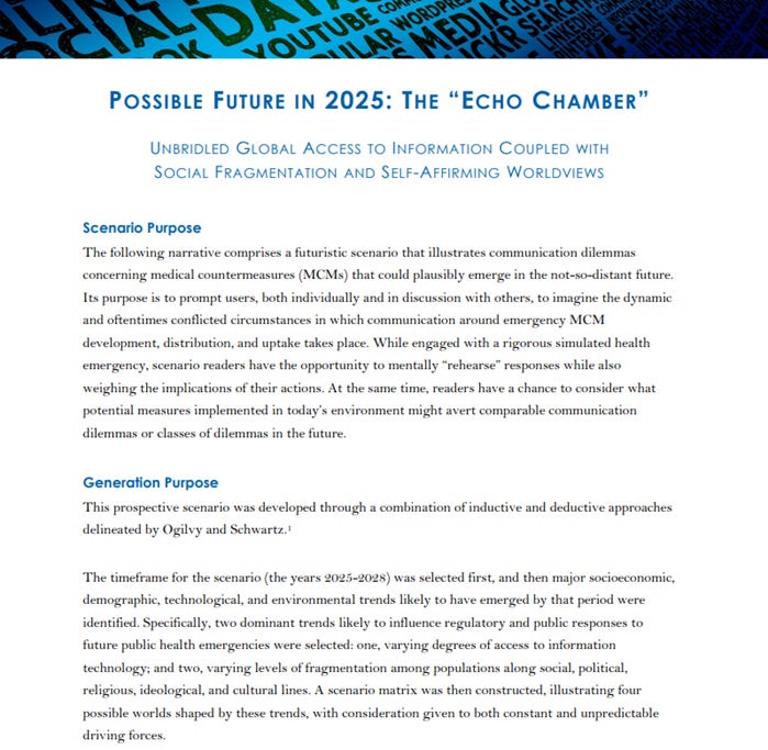 In full form, the new John Hopkins Center for Health Security report describes a “futuristic scenario” tasked with the challenge of resolving a series of “communication dilemmas” necessary for overcoming an “echo chamber” that would hinder the possibility of enacting new future pandemic responses.