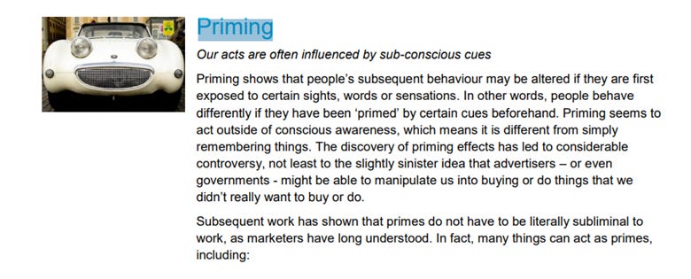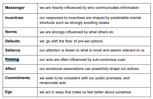 The MINDSPACE authors describe the importance of “salience and priming” when getting populations to make pre-determined decisions without eliciting the need for conscious decision-making i.e. “reflective processes”:
