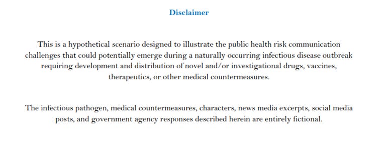The report goes on to detail the government response and public messaging campaigns that would be used to manage the fictional crisis, presumably learning from mistakes made in managing the supposed “disinformation” crisis which occurred in the wake of the last pandemic response.