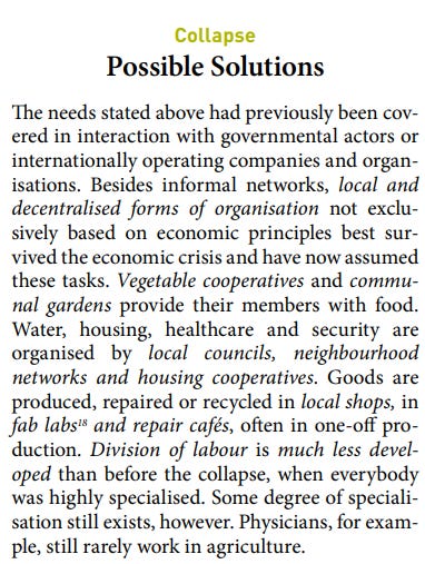 > Collapse. A second category features narratives of the future describing a sudden end of growth. The Collapse scenarios can be of an environmental, economic, health-related and moral nature. What they have in common is that all of them describe a regression to a “lower” level of development. In most cases, this is described as a less complex world and reaches from an economic crisis to regression into a new “dark age”, to the complete extinction of all life by an asteroid, for example.