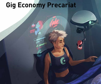 > Gig Economy Precariat. Machines have taken over many jobs and have caused technological unemployment. Instead of switching to other sectors, the people affected turn to a new type of employment: the gig economy. As digital day labourers, they fight for rare jobs in a thoroughly commercialised world.