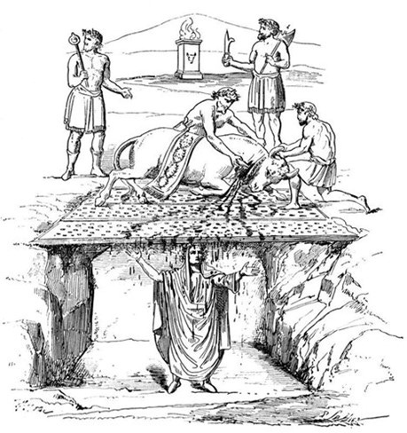 “The Taurobolium were gruesome ceremonies involving the sacrifice of bulls, which bled onto the priests overseeing the mystery rites, which featured prominently in the rituals of both cults.